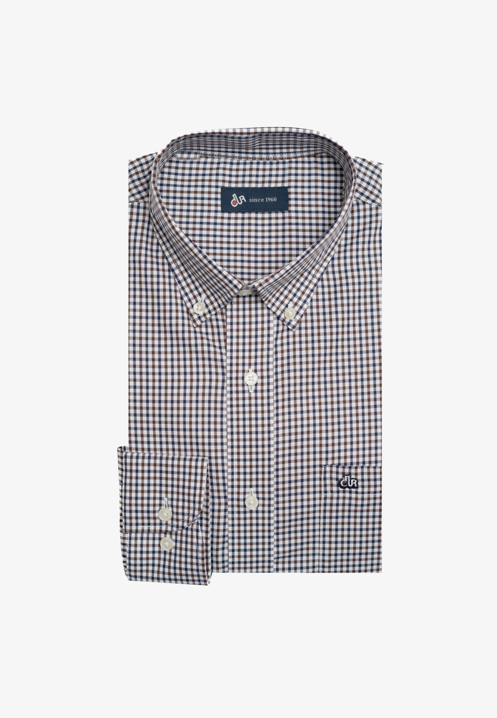 Checked shirt in regular line. Buttoned down collar, round pocket with embroidered the brand logo and round cuff with two adjustable buttons. Six buttoned placket front and box pleat at the back.