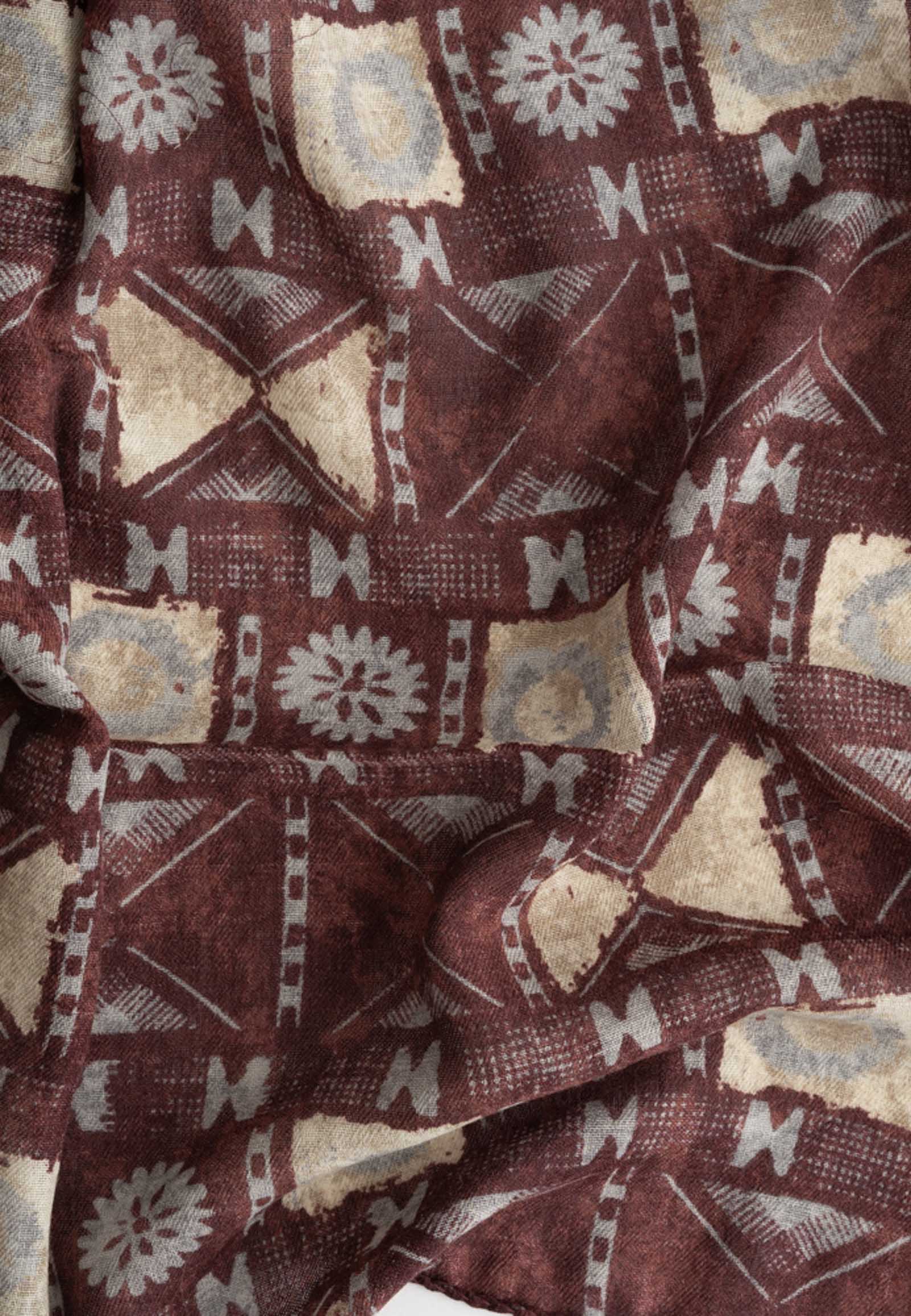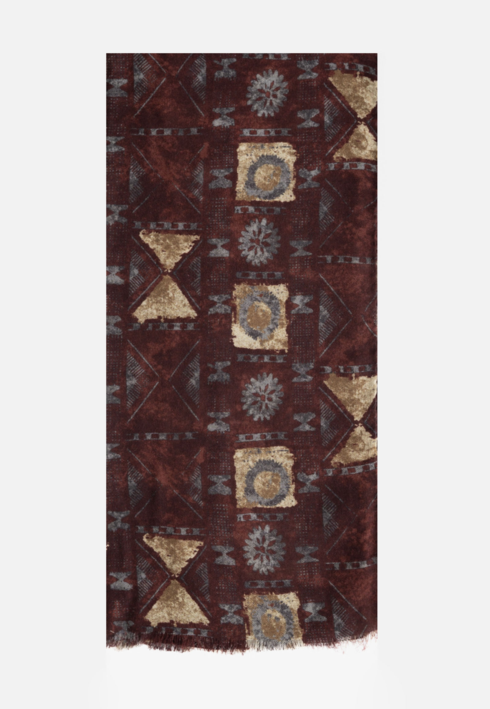 Ethnic-chic burgundy scarf made of 100% wool with geometric design.