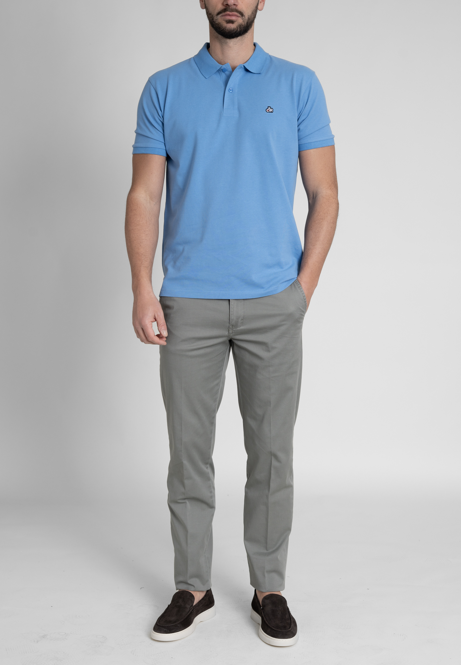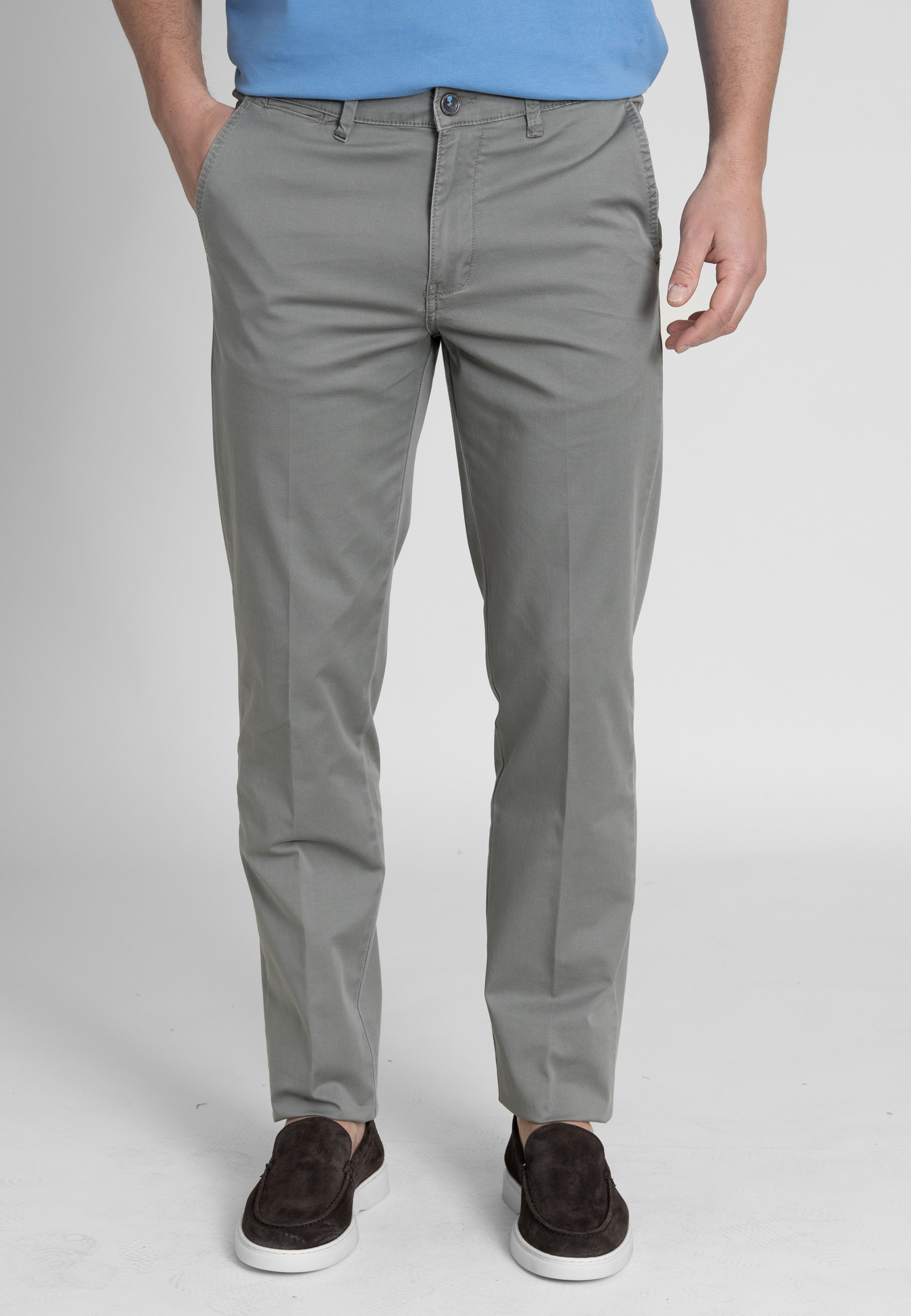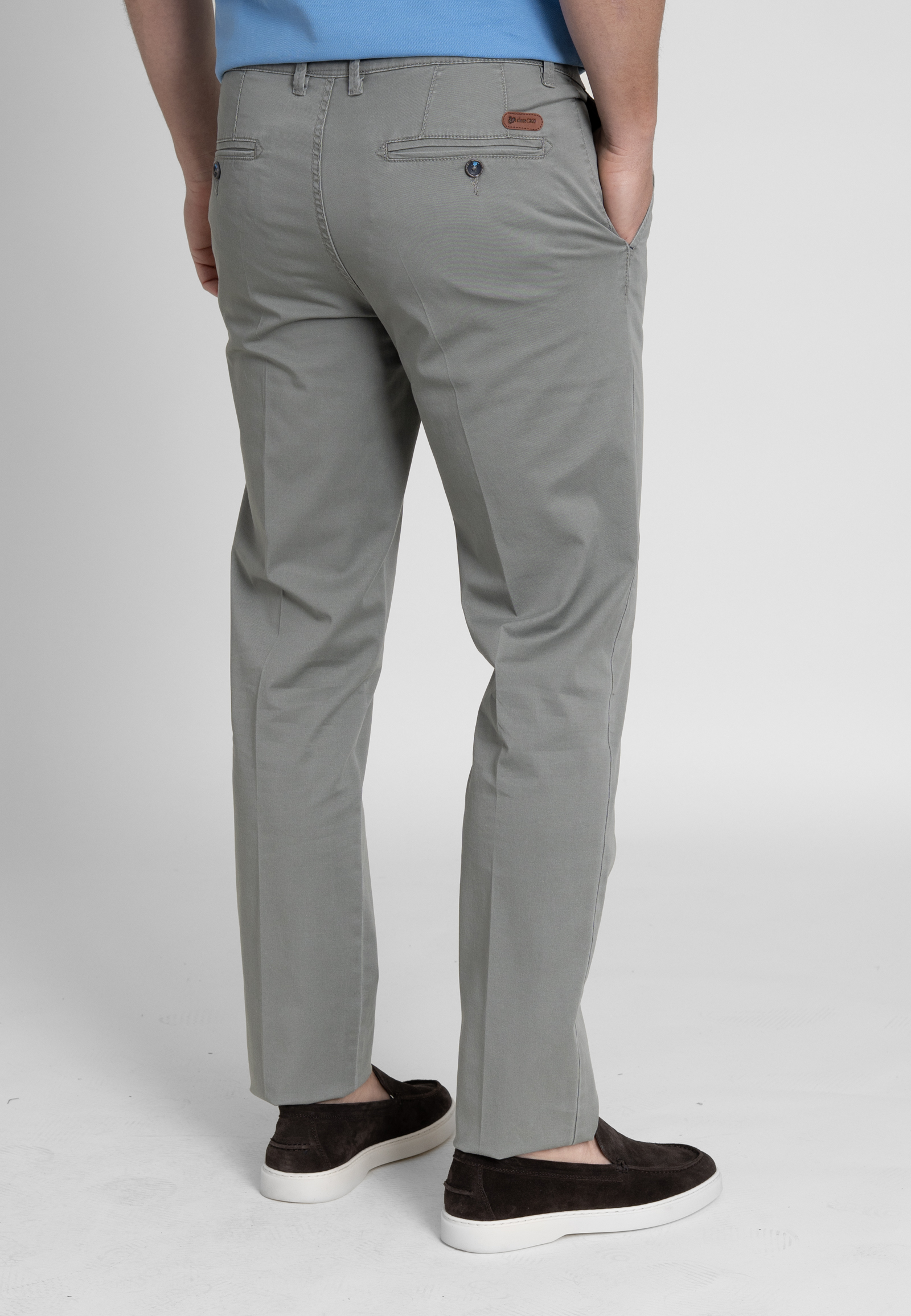 Light gabardine chinos in regular cut. Medium waist, zip fly and button fastening and two side pocket. Two buttoned welt pockets at the back and a leather tab embossed with the brand logo.