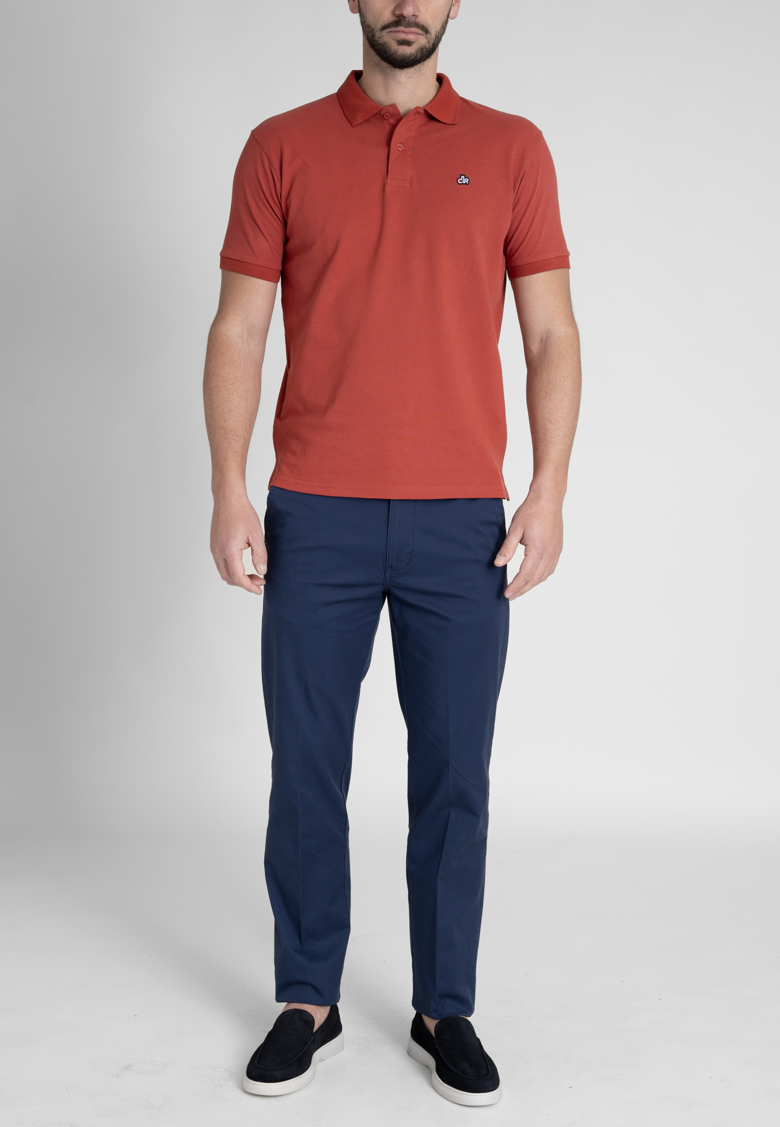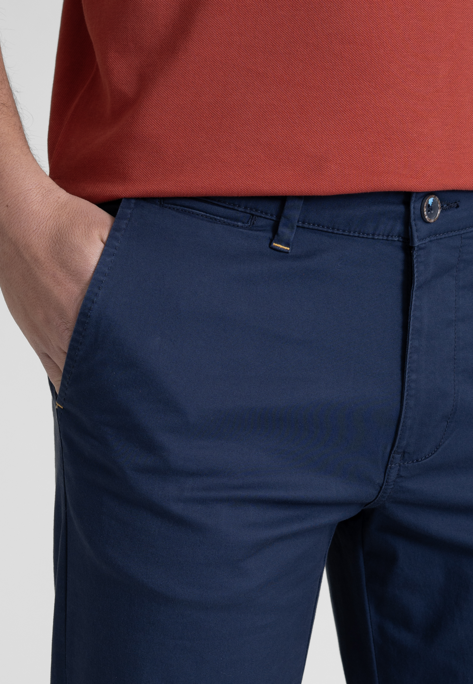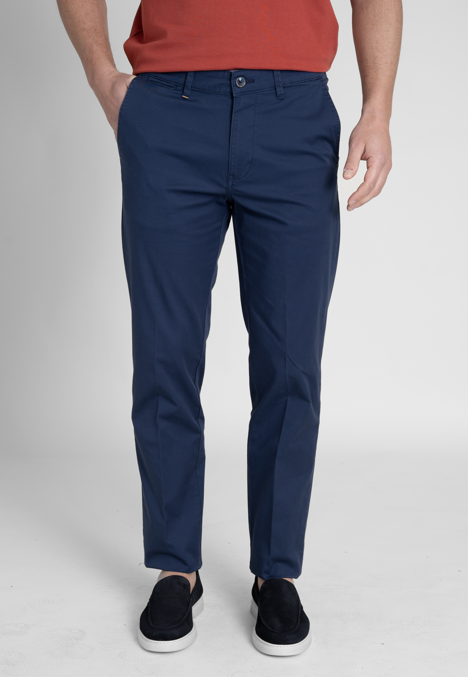 Light gabardine chinos in regular cut. Medium waist, zip fly and button fastening and two side pocket. Two buttoned welt pockets at the back and a leather tab embossed with the brand logo.