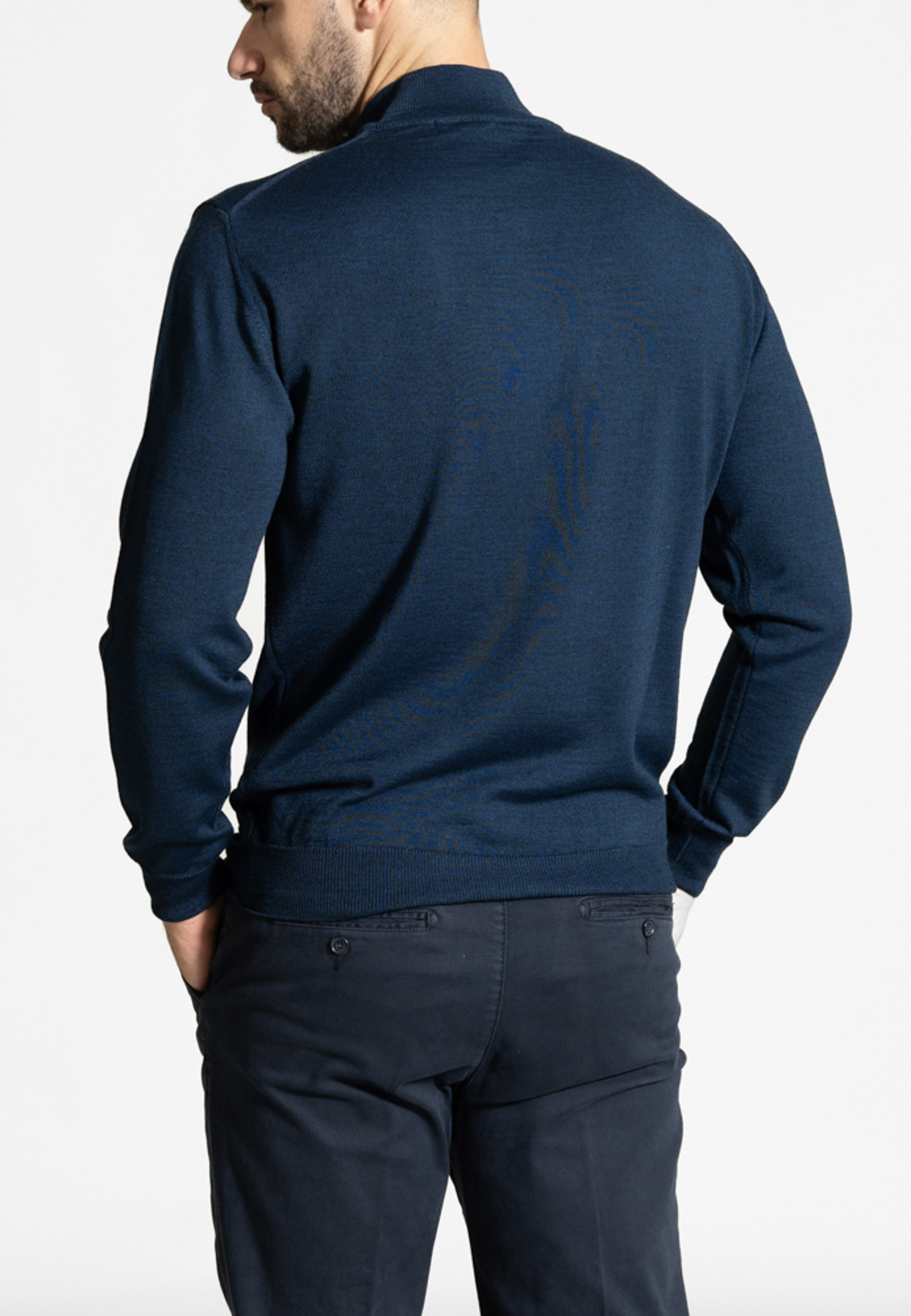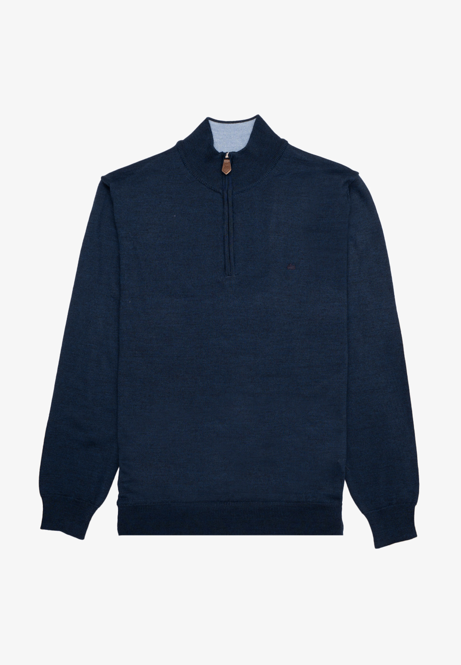 Zipped extra fine merino wool sweater in regular fit. Colour contrast inside collar. Fitted ribbed hem, sleeves with ribbed ends and collar mock neck.