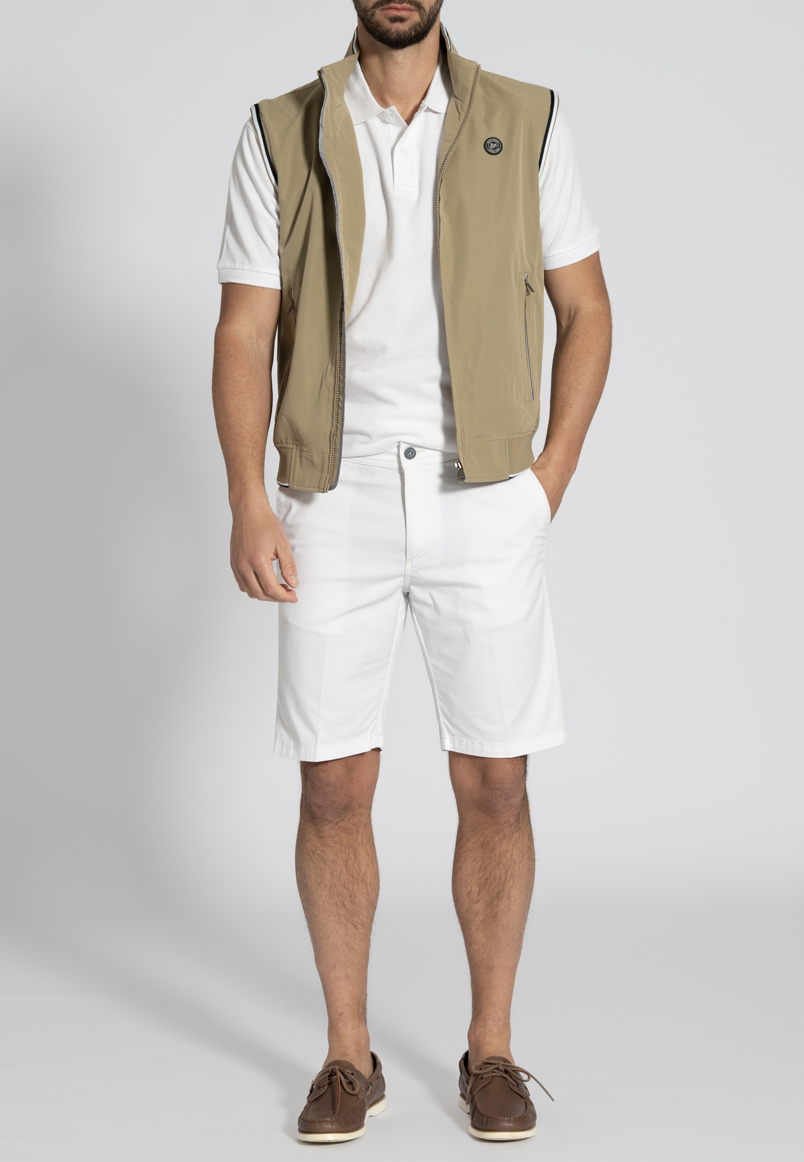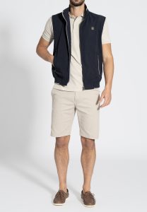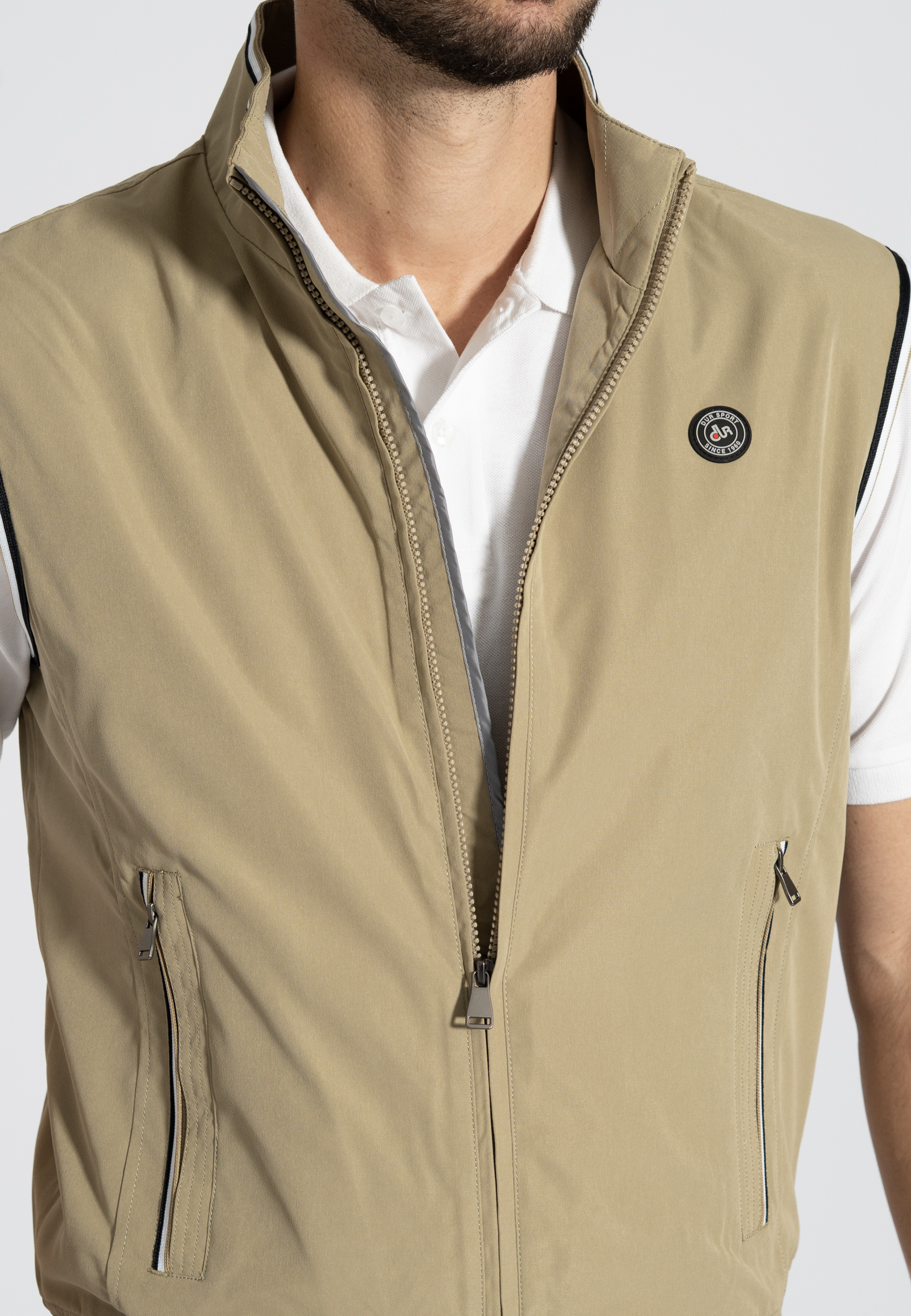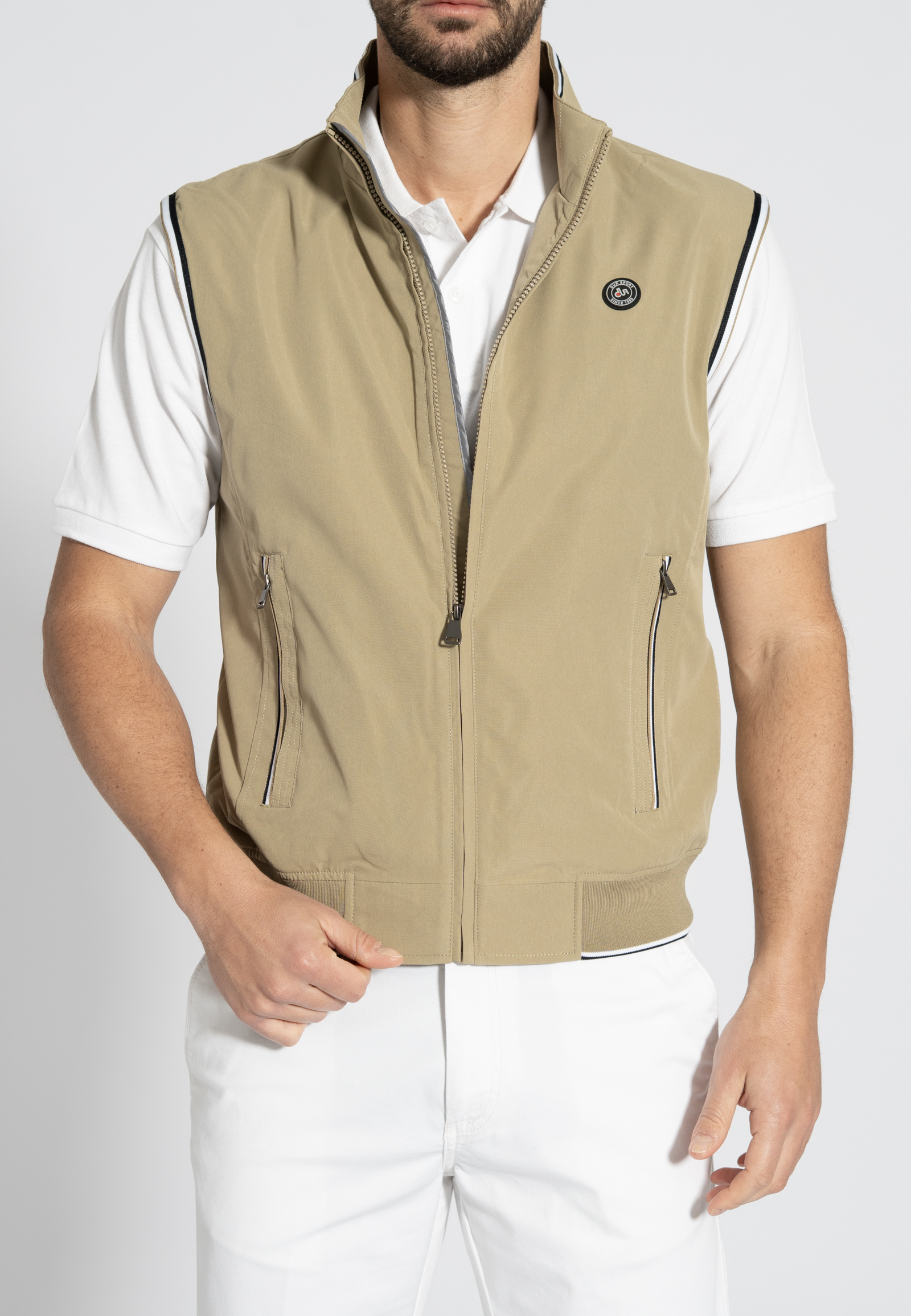 Light sleeveless vest in regular line with contrasting stripes. Ηigh collar, zip closure, two side zipped pockets and an inner.
