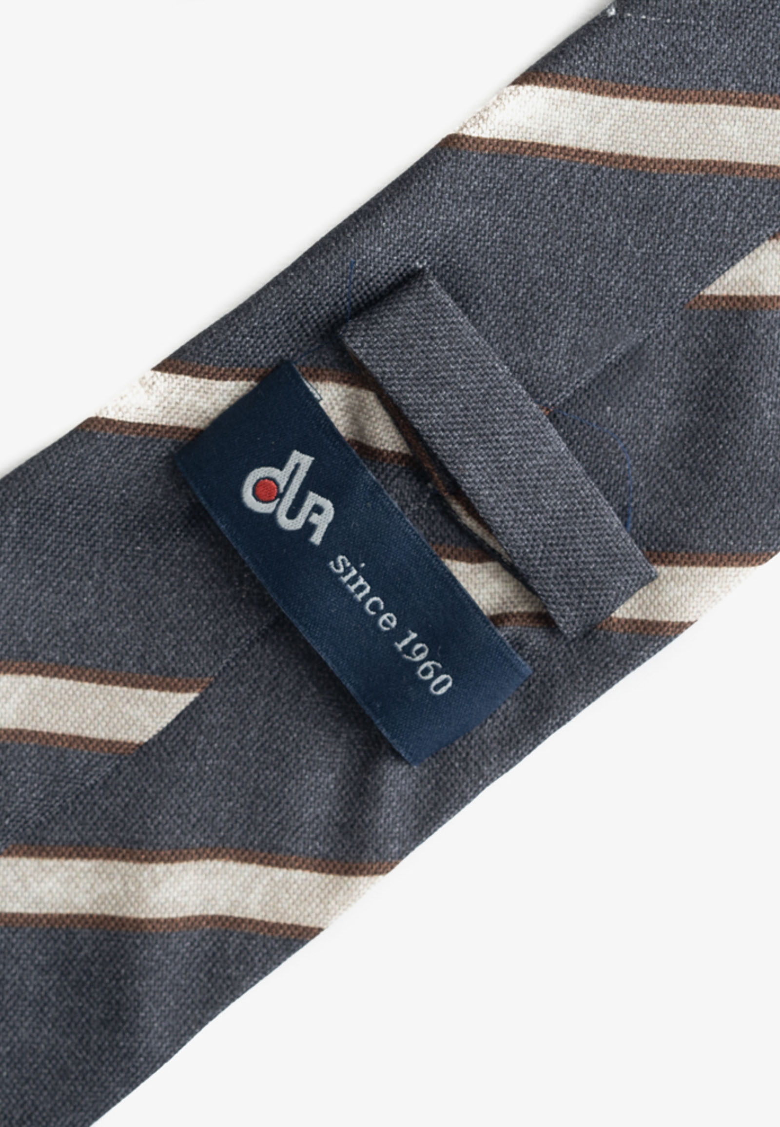 Γκρι μεταξωτή γραβάτα με σχέδιο ιβουάρ ρίγα. Η πίσω πλευρά είναι ντουμπλαρισμένη με φόδρα.